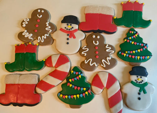12 unfrosted Christmas themed sugar cookies with 3 bags of royal icing and sprinkles that you can decorate yourself!! Icing comes with a red bag, a white bag, and a green bag.